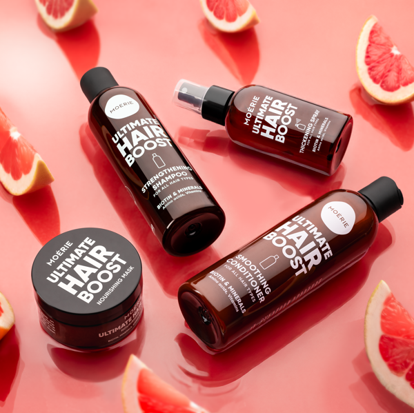 Moérie propose une gamme complète de produits capillaires infusés en biotine et minéraux pour promouvoir une croissance optimale des cheveux :